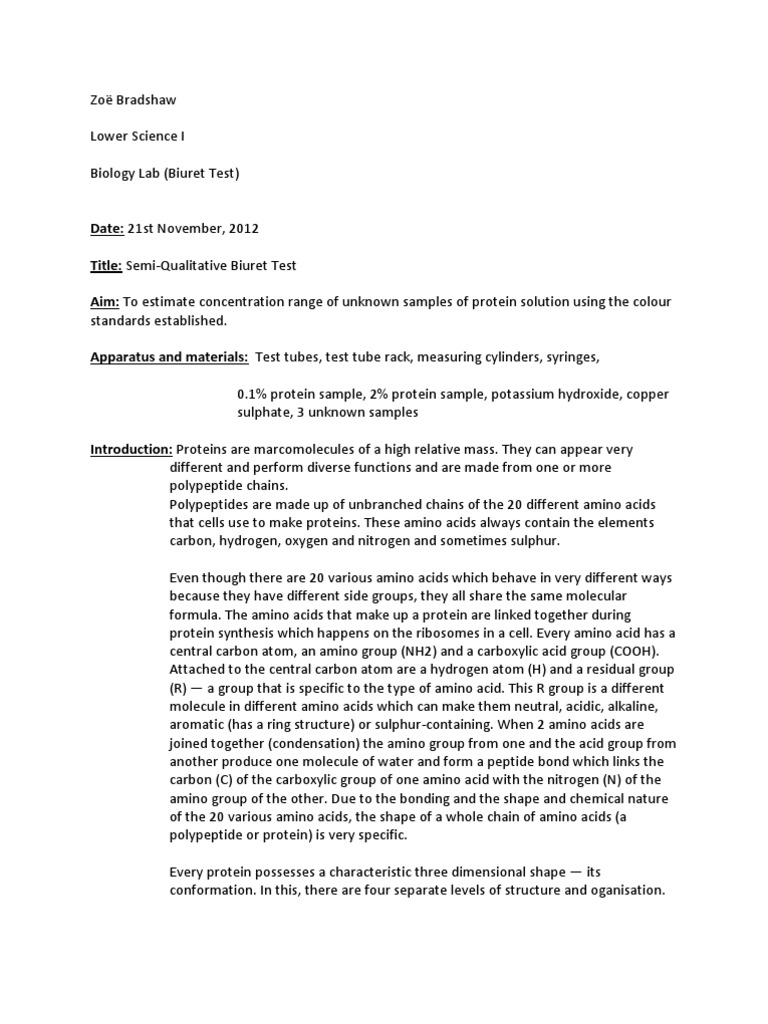 Lab Report Testing For Proteins Testing For Proteins In Different Substances Using The Biuret Reagent Casey Schonhardt Biol 1040 Section 1002 Course Hero