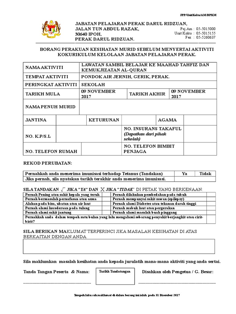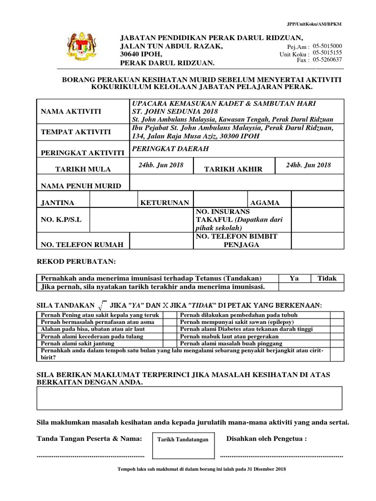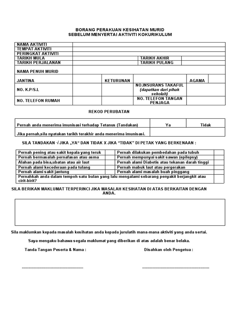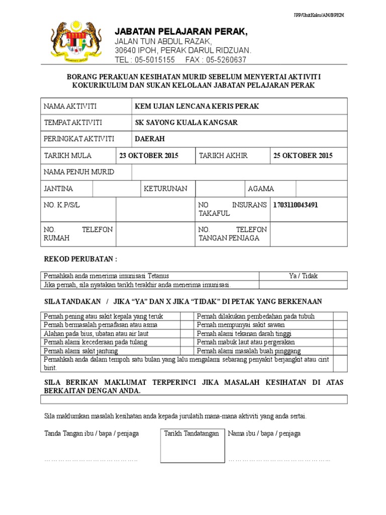 Surat Akuan Kebenaran Ibu Bapa Penjaga Lampiran 2 Borang Perakuan Kesihatan Murid Sebelum Menyertai Aktiviti Kokurikulum Luar Nama Aktiviti Tempat Aktiviti Peringkat Aktiviti Tarikh