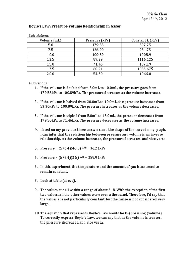 Boyle s law lab report laboratory reports are utilized to explain the study results. This law can be expressed mathematically as follows. Boyle s law was derived from a scientist named robert boyle who found that at a constant temperature the pressure of a given gas was inversely proportional to its volume. They must be readable and need to be provided in a clear and succinct manner.
