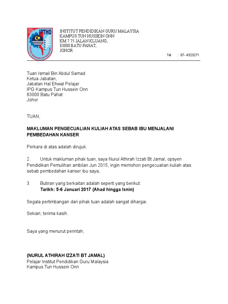 Contoh Surat Memohon Pengecualian Kuliah 2 Docx Anas Bin Mohd Hanafiah D20171077586 Fakulti Bahasa Dan Komunikasi Universiti Pendidikan Sultan Idris Course Hero