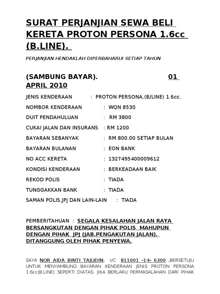 Contoh Surat Perjanjian Sambung Bayar Kereta Masih Ada Loan Dengan Bank