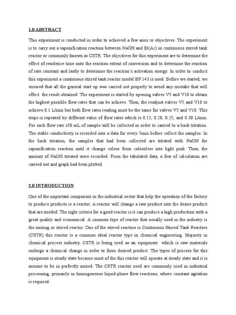 246737217 Cstr Lab Report 2 0 Objectives Experiment A Batch Stirred Tank Reactor Experiments To Determine The Order Of Saponification Reaction To Course Hero