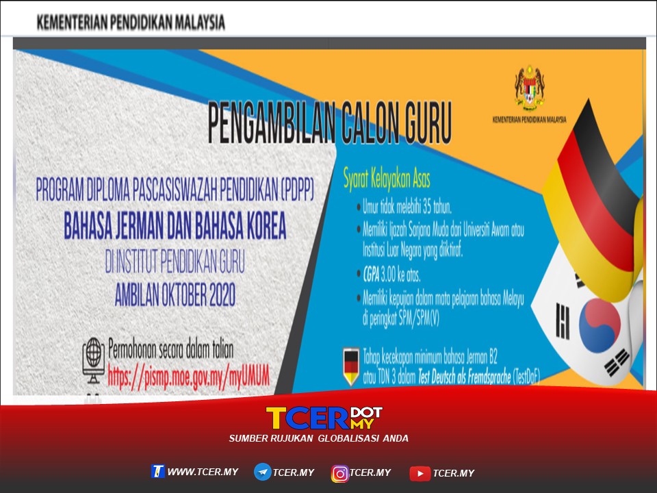 Kementerian pendidikan malaysia kpm mempelawa calon yang berkelayakan berpotensi berminat dan beriltizam untuk memohon program diploma pascasiswazah pendidikan pdpp bahasa jerman dan bahasa korea sepenuh masa di institut pendidikan guru ambilan oktober 2020. Kerja kursus kredit kursus teras pendidikan 15 kursus pengkhusususan pertama 9 kursus pengkhusususan kedua 6 kursus persediaan professional 6 jumlah kredit 36. Https pismp moe gov my myumum pdf muat turun iklan 290 kb.