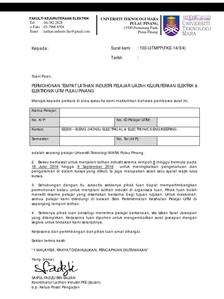 Contoh Surat Permohonan Praktikal Uitm Negeri Sembilan Lain Lain Negeri