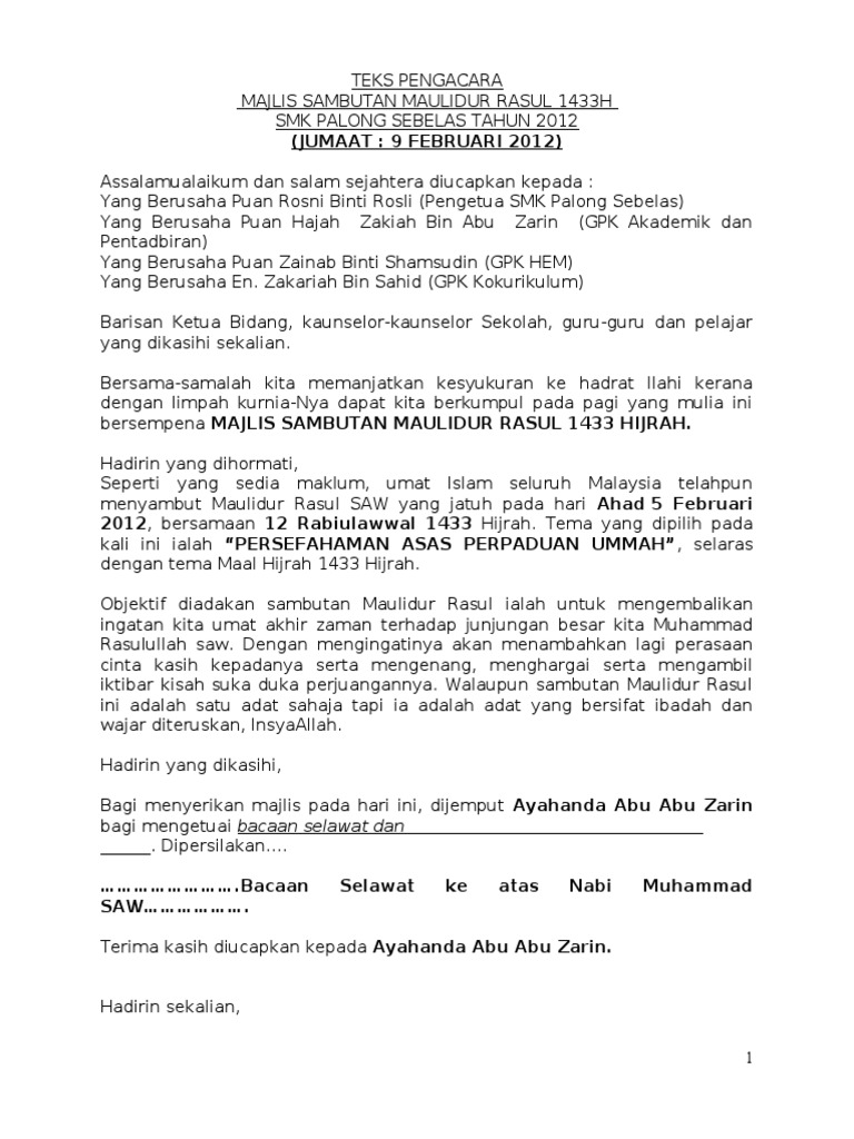 Teks Pengacara Majlis Sambutan Maulidur Rasul Peringkat Sk Balik Pulau Docx