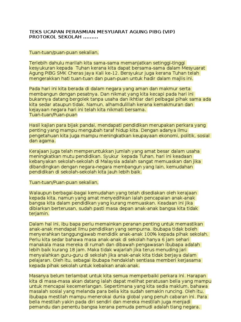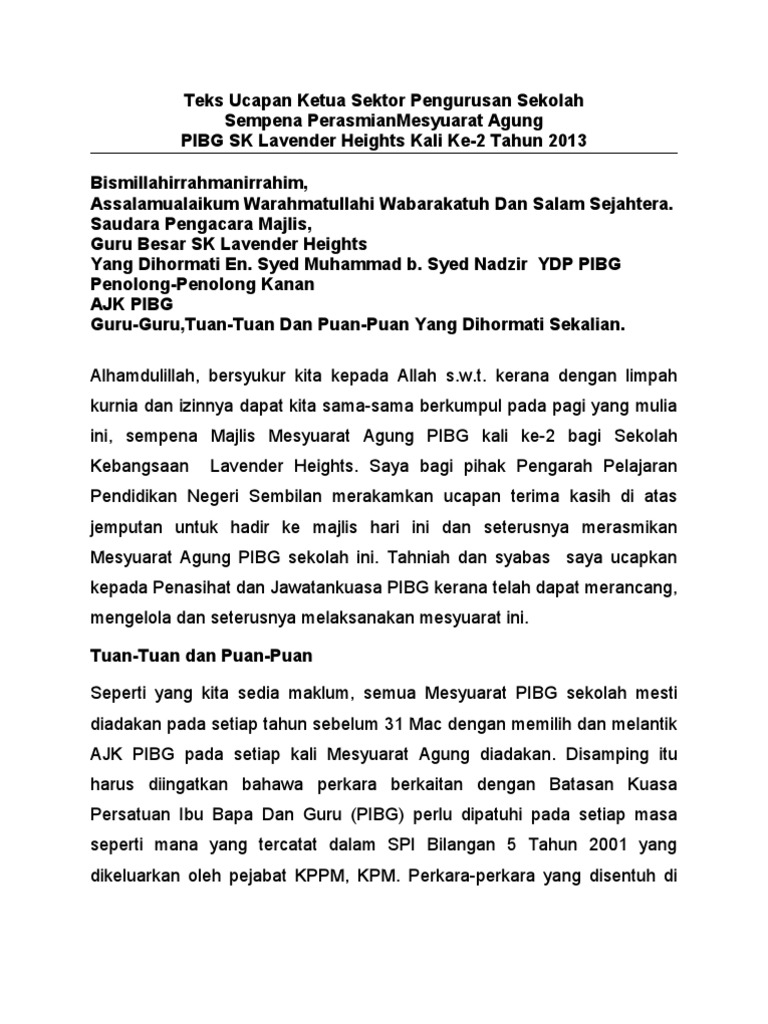 Teks Ucapan Ydp Pibg Sempena Mesyuarat Agung Pibg Smk Pernu Kali Ke